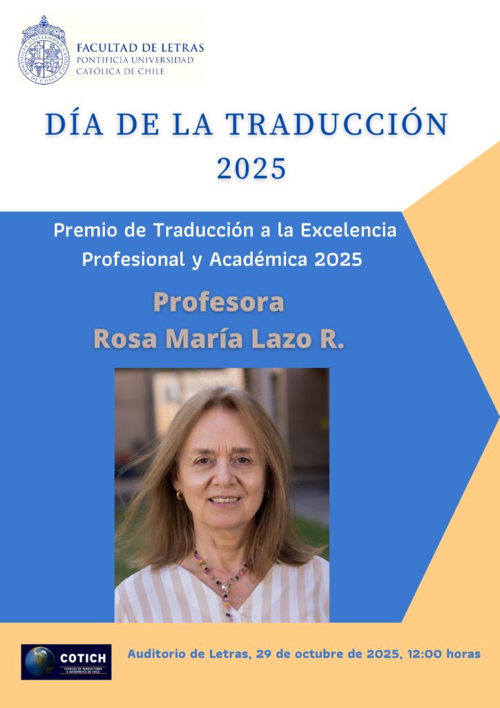 Como es tradición, se entregará el Premio de Traducción a la Excelencia Profesional y Académica, reconocimiento que este año recae en la profesora Rosa María Lazo R.