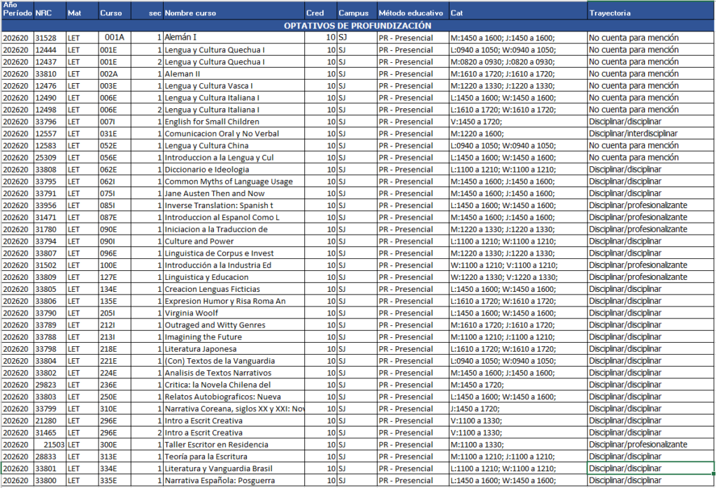 | Año Período | Nivel | NRC | Mat | Curso | Sec | Nombre Curso | Créds | Campus | Vacs Ofre | Horario | Apellido Paterno Profesor | Nombre Profesor |